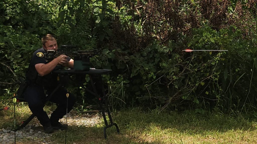 Police Officer Alex Lunsford fires a TenPoint crossbow from a 50 yard distance at a styrofoam wolf. He competed on a team with officer Austin Smith against the fire department at Cedar Falls Outdoors annual Bow Bash.